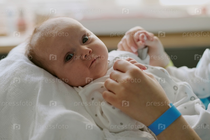 Портрет ребенка, лежащего на белом одеяле в мягком освещении