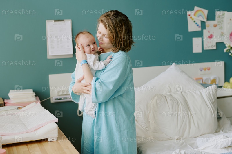 Мать, держащая новорожденного ребенка в больничной комнате
