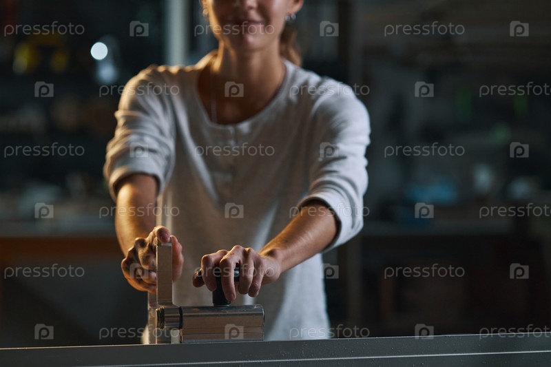 Женщина, использующая режущую машину для резки древесины