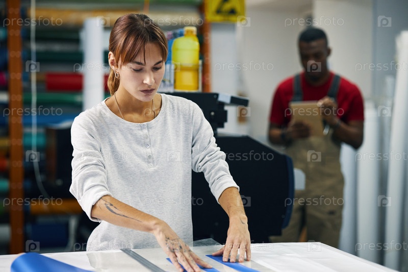 Женщина режет бумажные полоски на своем рабочем месте в мастерской