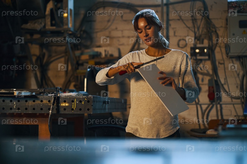 Женщина-работница обрабатывает планку с мельницей