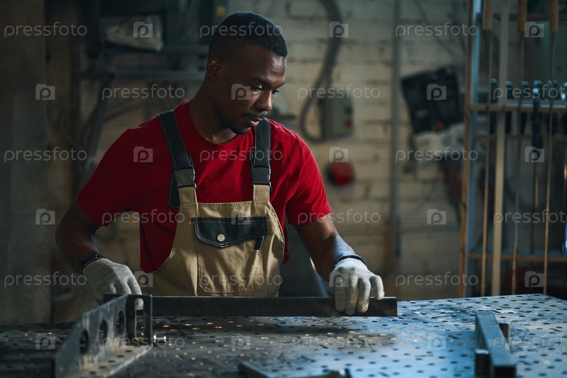 Работник, выполняющий металлическую раму для рабочего знака
