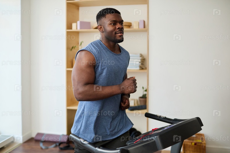 Улыбающийся мужчина тренируется на беговой дорожке в современной комнате
