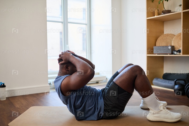 Упражнения на полу в домашнем тренажерном зале возле окна