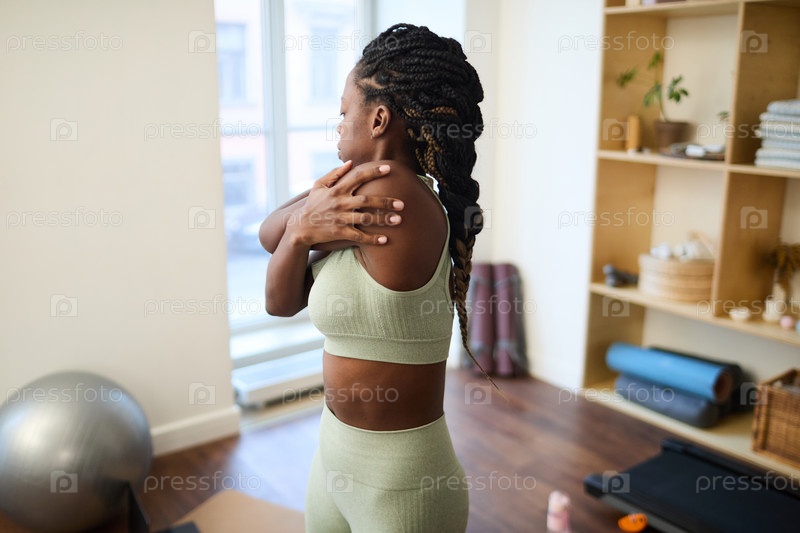 Упражнения по растяжке молодой женщины в минималистическом домашнем тренажерном зале