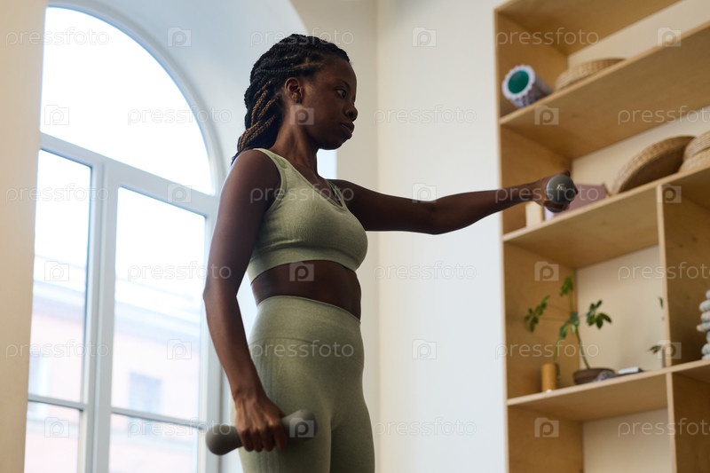 Афроамериканская женщина занимается упражнениями с гантеликами в помещении