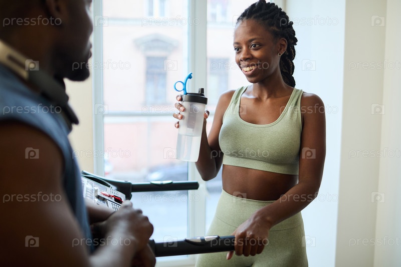 Друзья, беседующие в современном фитнес-центре