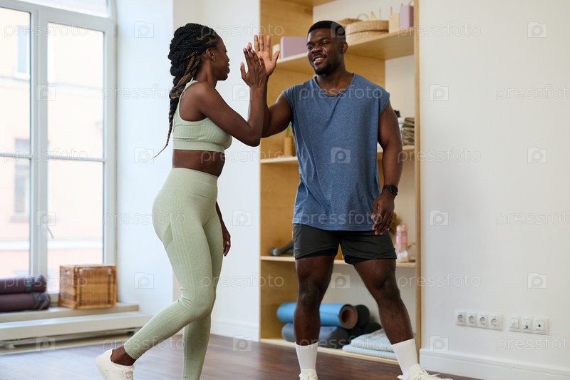 Упражнения вместе с жестом высоких пяти в яркой комнате