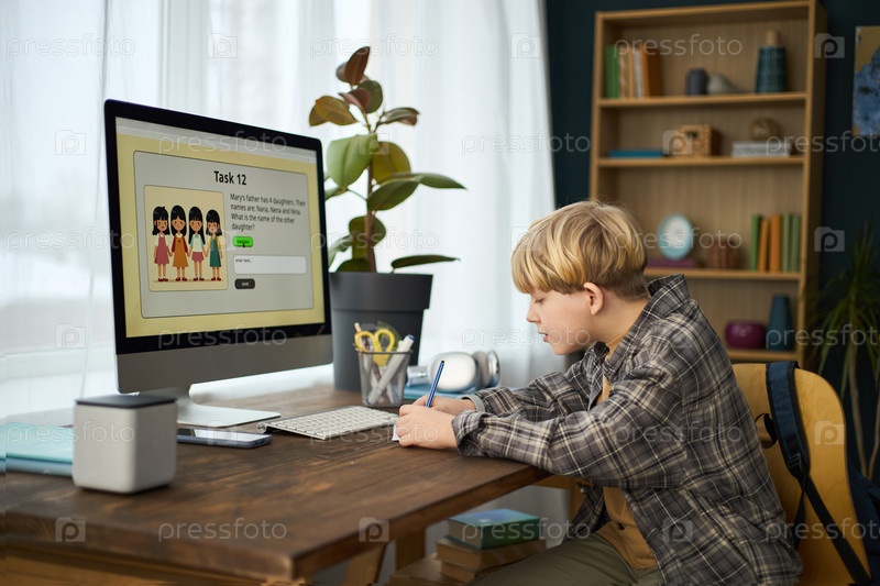 Молодой мальчик учится за рабочим столом с онлайн-задачей обучения