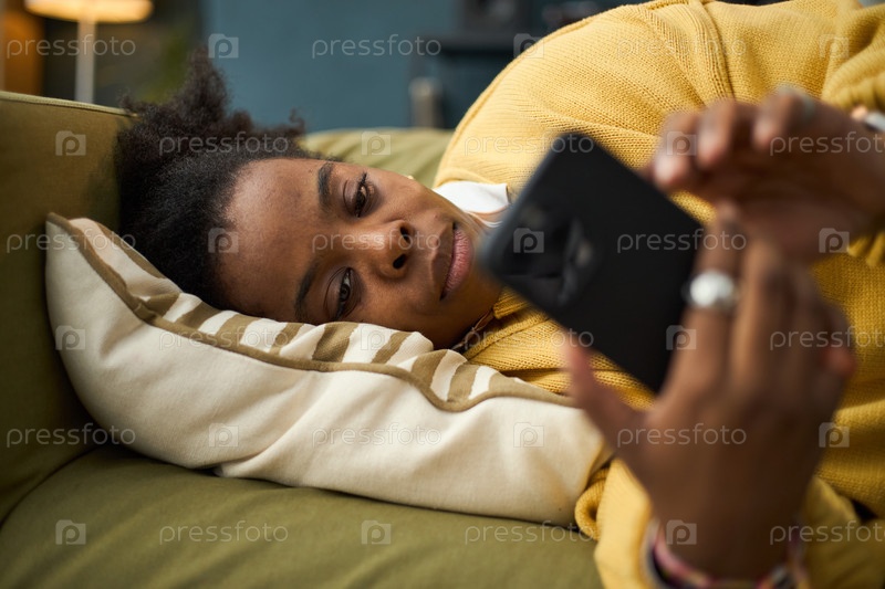 Женщина отдыхает на диване, используя смартфон для развлечения