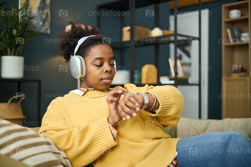 Ношение наушников Проверка Smartwatch Женщина