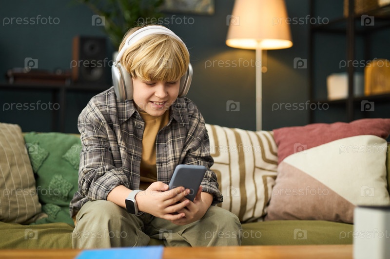 Молодой мальчик носит наушники и держит смартфон