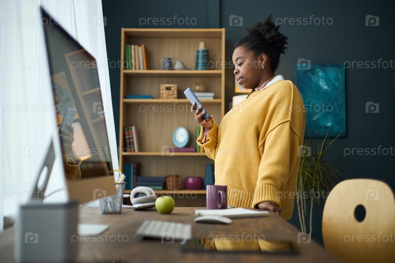 Женщина-американец проверяет смартфон афроамериканцы
