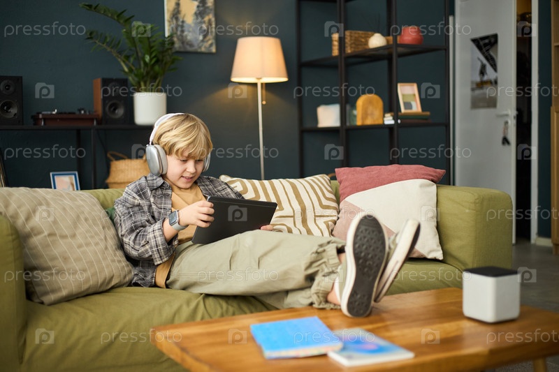 Мальчик, сидящий на диване с наушниками и планшетом