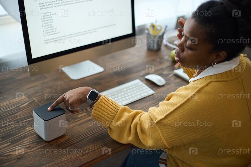 Молодая афроамериканская женщина регулирует устройство умного динамика