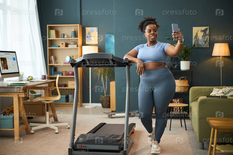 Женщина занимается в помещении на беговой дорожке, делая селфи