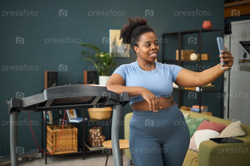 Портрет женщины, занимающейся на беговой дорожке в домашнем тренажерном зале