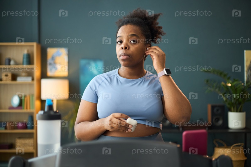 Портрет женщины, регулирующей наушники на беговой дорожке
