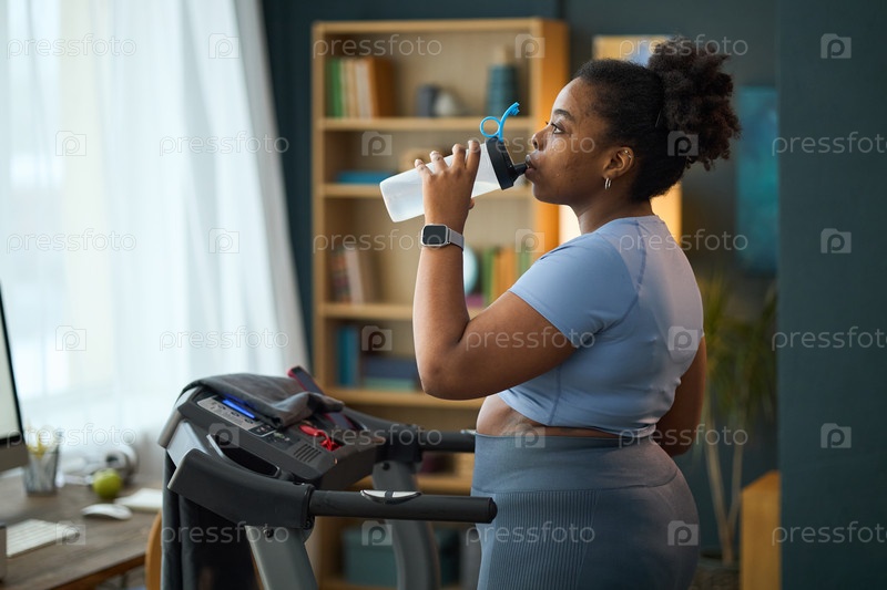 Женщина пьет воду во время тренировки на беговой дорожке