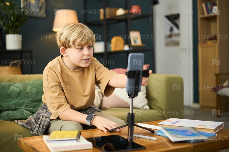Молодой мальчик сидит на диване, держа мобильное устройство