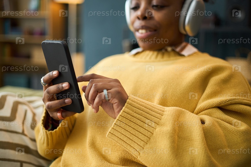 Портрет афроамериканской женщины, использующей наушники для смартфонов