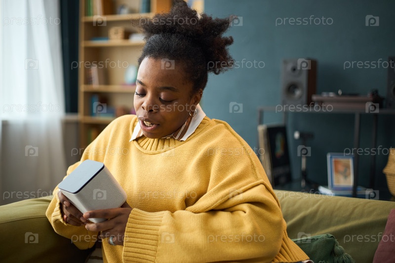 Женщина, анализирующая портативный динамик в современной гостиной