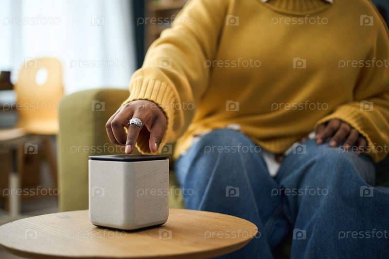 Женщина, использующая умный динамик в уютной домашней обстановке
