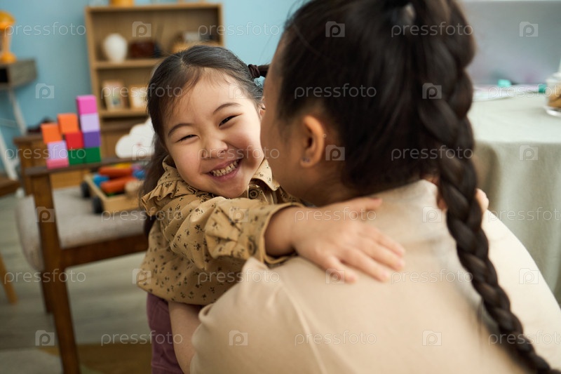 Улыбающийся ребенок обнимает женщину внутри в игровой комнате