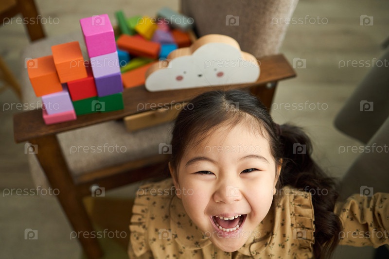 Улыбающаяся азиатская девушка наслаждается красочными деревянными блоками