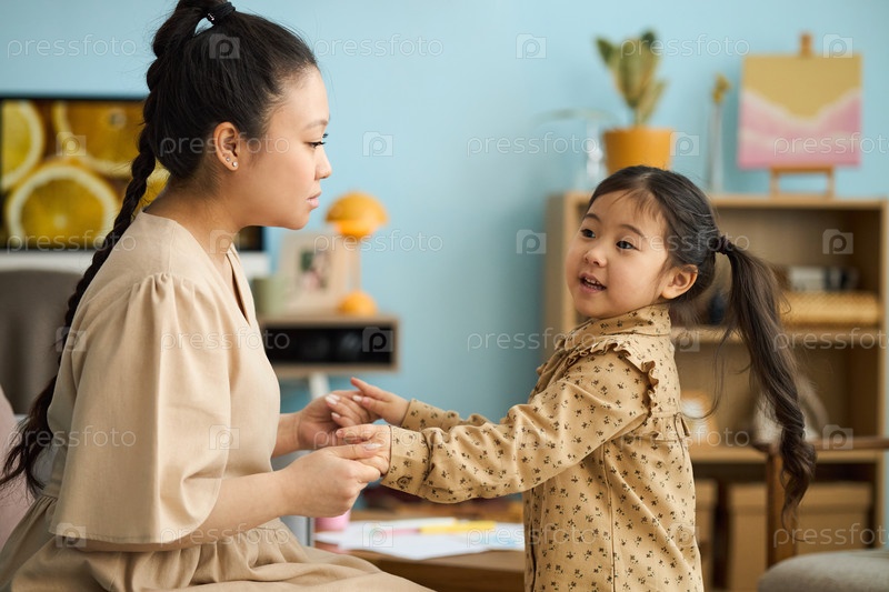 Женщина, взаимодействующая с молодой девушкой в светлой гостиной