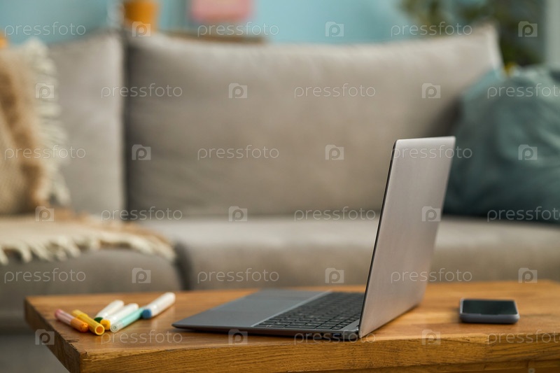 Ноутбук на кофейном столе возле серого дивана в гостиной