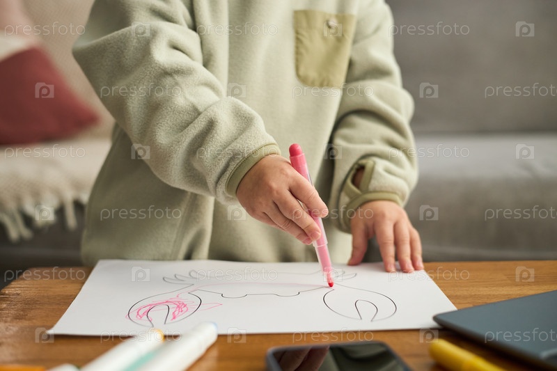 Маленький ребенок рисует, стоя за столом