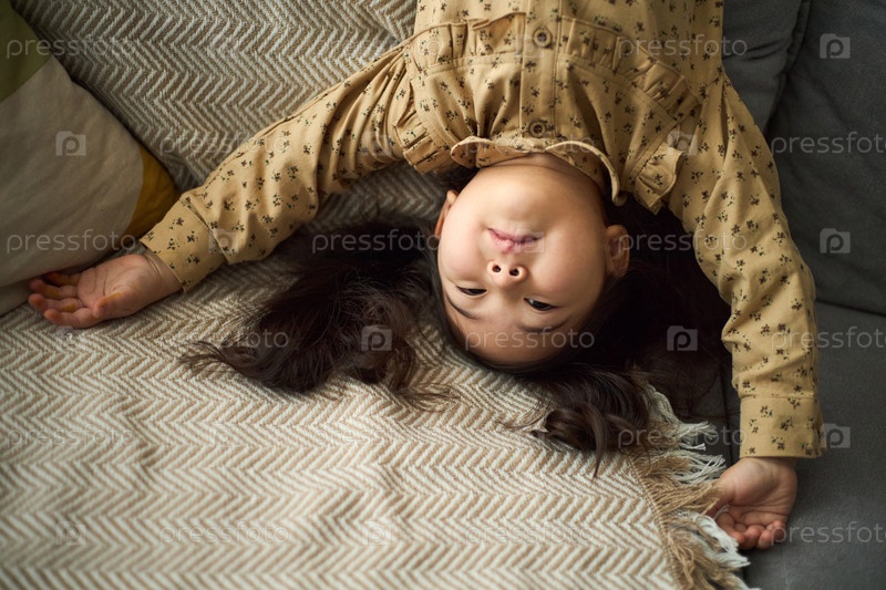 Молодая девушка, лежащая на диване вверх ногами и улыбающаяся