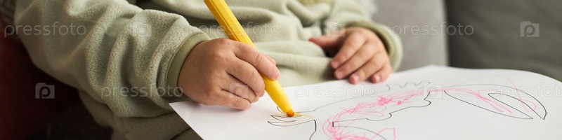 Ребенок рисует желтым карандашом на белой бумаге