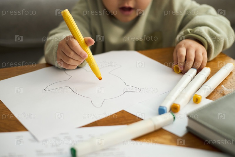 Ребенок рисует картину черепахи с желтым маркером