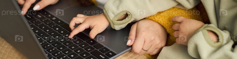 Семейные руки печатают на ноутбуке вместе во время обучения