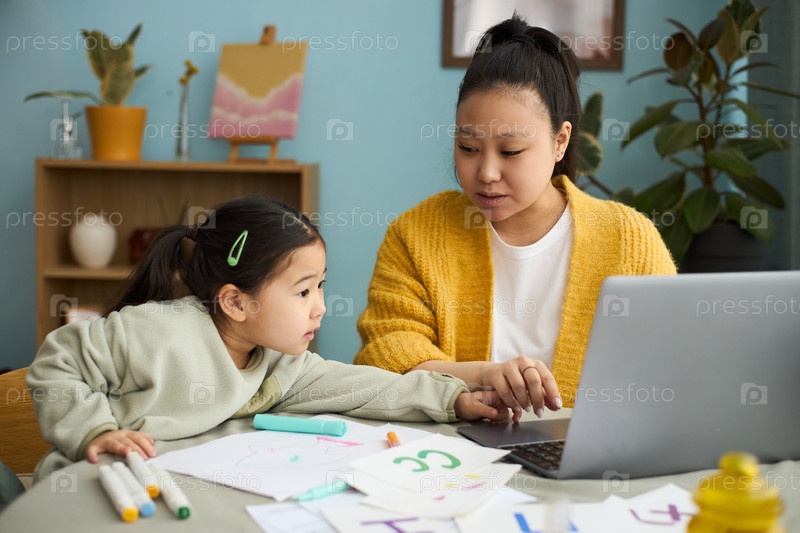 Мать помогает дочери с домашними заданиями дома
