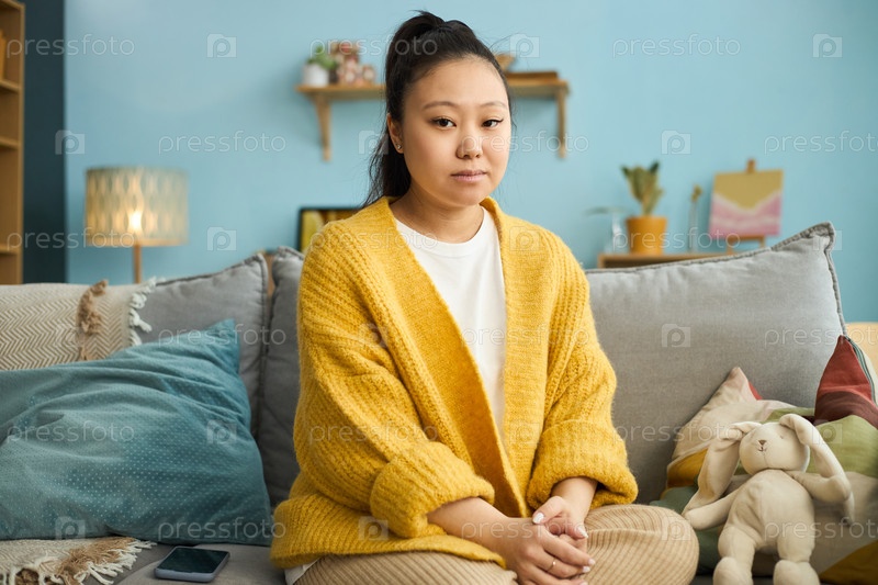 Портрет вдумчивой азиатской женщины, сидящей на диване