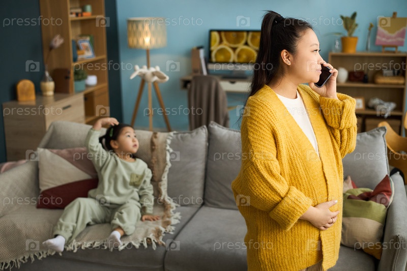 Беременная женщина разговаривает по телефону с ребенком, играющим рядом