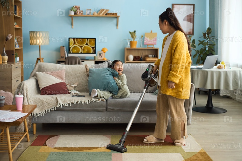 Высушивание гостиной, в то время как ребенок наслаждается диваном