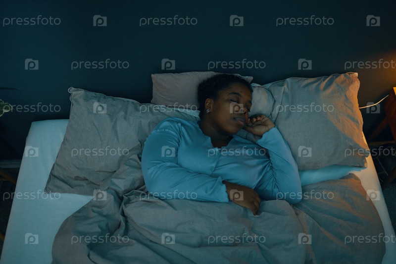 Спающая афроамериканская женщина отдыхает в удобной кровати