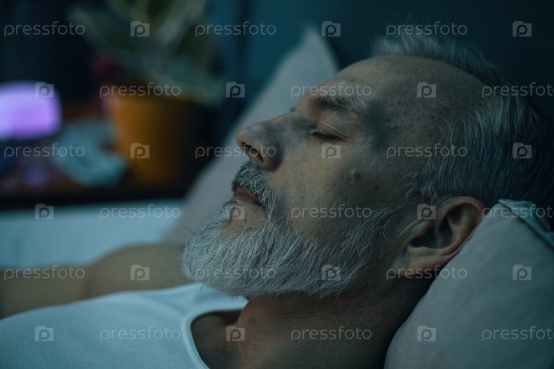 Спящий пожилой человек с седой бородой и расслабленным выражением лица