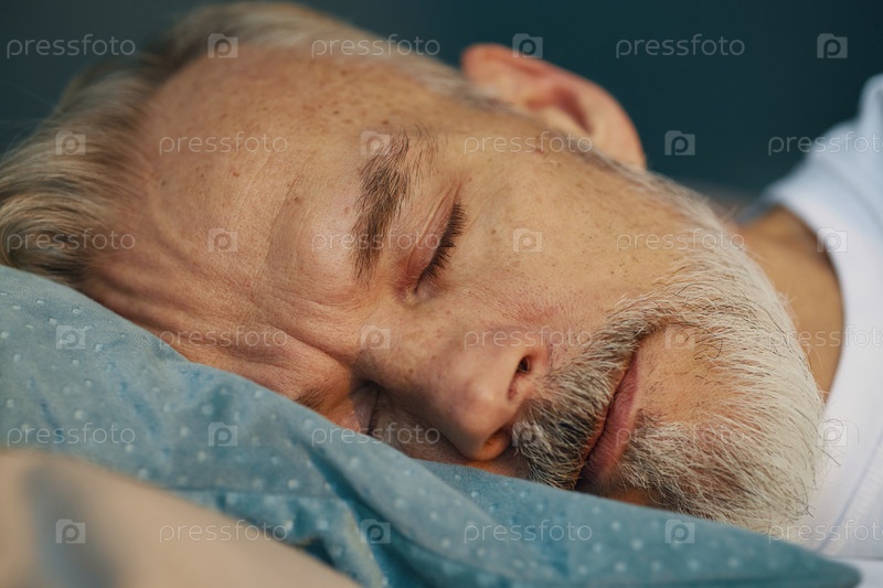 Спящий пожилой человек Спокойно отдыхает в постели