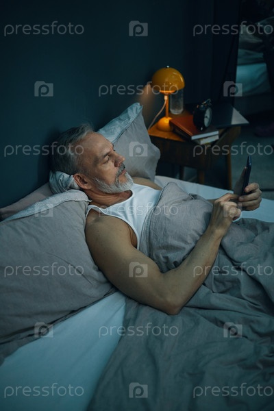 Пожилой мужчина использует смартфон в постели, обращенный к боковой стороне