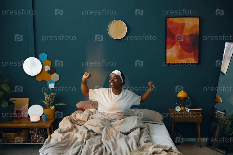 Улыбающаяся утренняя растяжка в уютной обстановке спальни