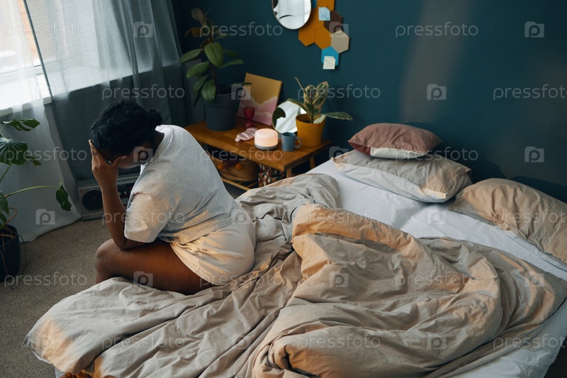 Женщина, сидящая на кровати утром и держащая голову