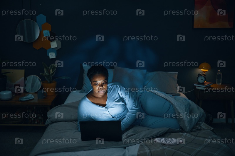 Портрет женщины, использующей ноутбук в слабо освещенной спальне