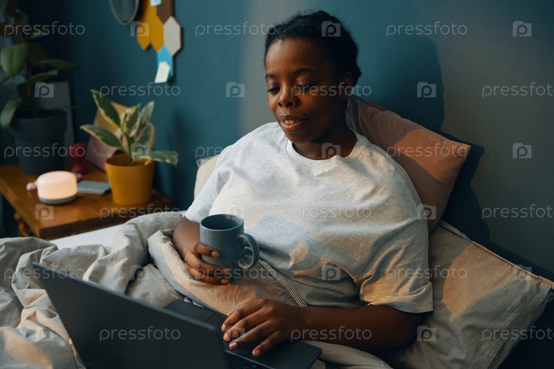 Женщина отдыхает в постели с ноутбуком и пьёт