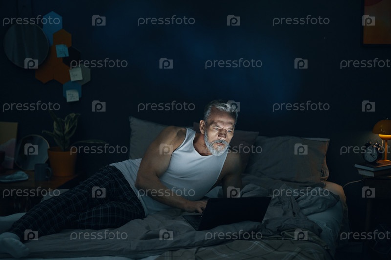 Пожилой мужчина использует ноутбук в темной комнате