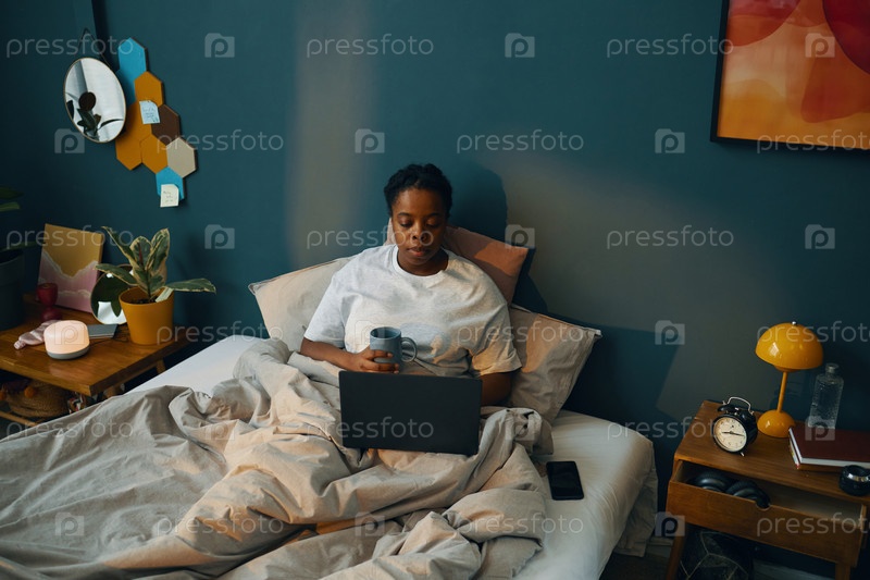Расслабляющая женщина сидит в постели, держит кружку и ноутбук